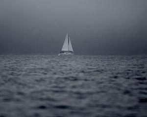 Sailboat in fog on Lake Lanier in Flowery Branch, Georgia